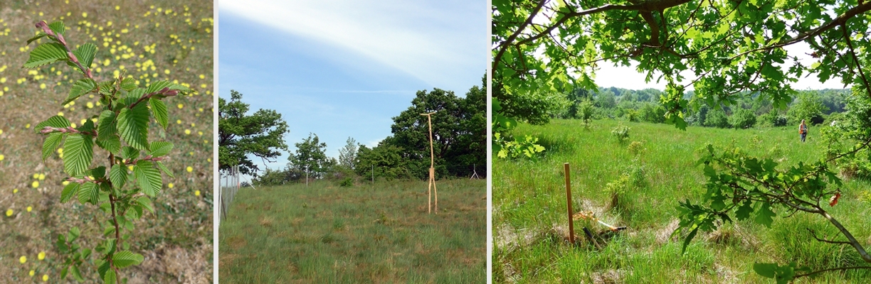 Durch einen Wildzaun sind die jungen Pflanzen vor Verbiss durch größeres Wild geschützt. Ein neuer Ansitz bietet Greifvögeln gute Übersicht für die Jagd auf Nager, welche den Jungpflanzen ebenfalls schaden könnten.