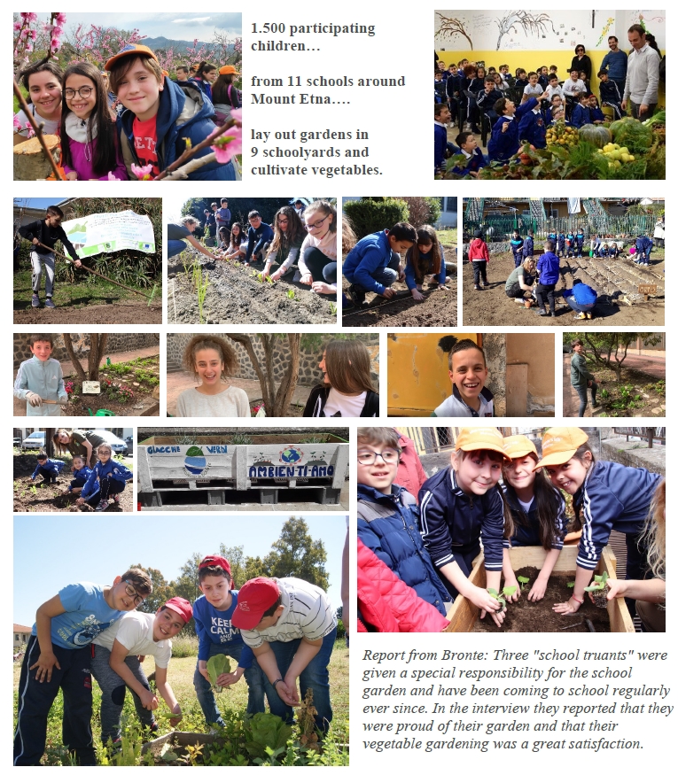 Thanks to a one-time grant from the BMU (EUKI programme) we were able to start a new environmental education project on Mount Etna: It is about climate protection through nutrition, according to the motto: local/ regional/ seasonal and - if possible - organic. The central activity is gardening in schoolyards. In addition, the children visit farms, and for some cities farmers' markets and exchanges of experts are organized. Before school activities, there are lessons in the classroom, and our international young ERASMUS volunteers help with all of this.