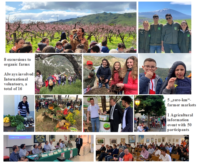 Thanks to a one-time grant from the BMU (EUKI programme) we were able to start a new environmental education project on Mount Etna: It is about climate protection through nutrition, according to the motto: local/ regional/ seasonal and - if possible - organic. The central activity is gardening in schoolyards. In addition, the children visit farms, and for some cities farmers' markets and exchanges of experts are organized. Before school activities, there are lessons in the classroom, and our international young ERASMUS volunteers help with all of this.